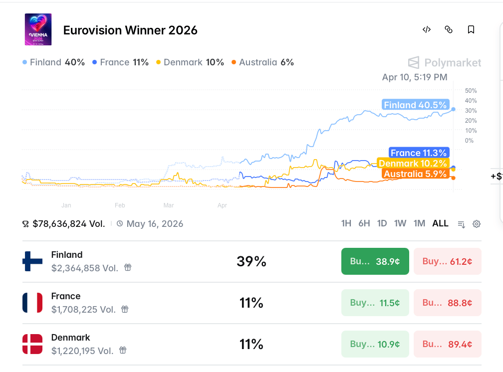 The $79 million in volume is a reminder that Eurovision is a serious prediction market event.