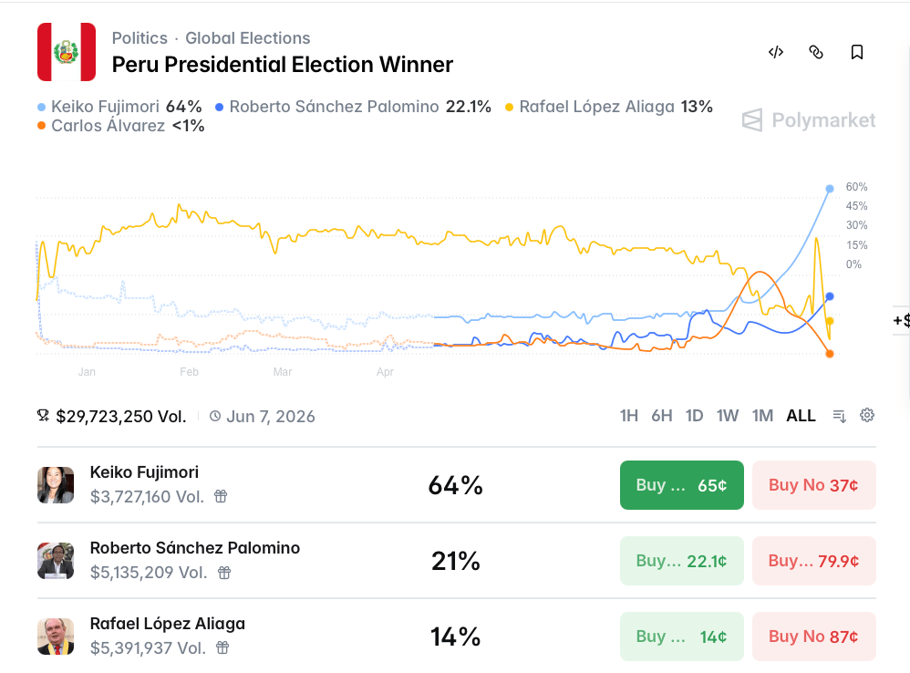 Polymarket has her at 65% to win the Peruvian presidency. $30 million in volume. And that number just doubled. Yet, she was sitting at 31% a week ago.