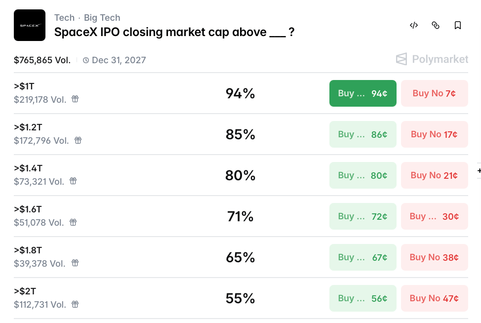 Polymarket is running a clean series of "above X" contracts on SpaceX's first-day closing market cap. Here's where things stand: