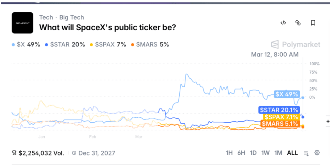 Polymarket is at $2.2 million in volume on what will SpaceX’s public ticker be…