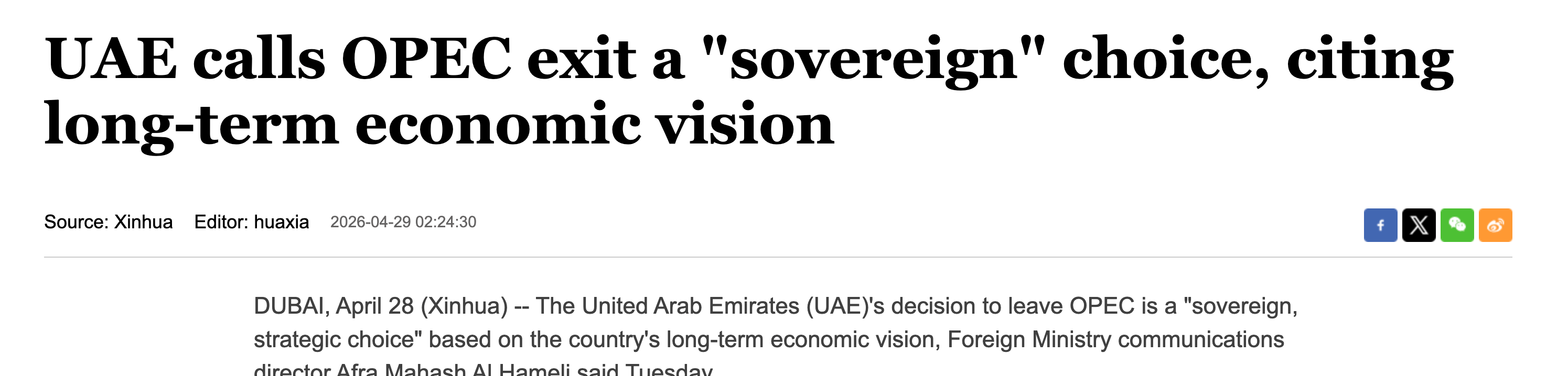 State media framed the exit as aligning with the UAE's "long-term strategic and economic vision" and commitment to "gradual and measured production aligned with demand."