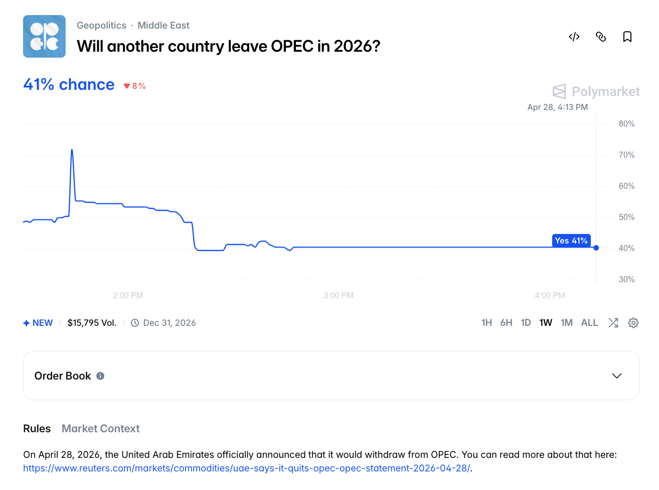 Within hours of the announcement, Polymarket opened a new contract: will another OPEC member officially announce its withdrawal before December 31, 2026?