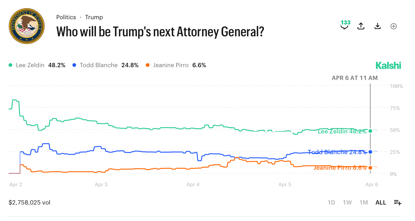 The fact that the market still has Zeldin at 48% despite Blanche sitting in the chair suggests Trump has signaled. Through leaks, through reporting, or through his own conversations, that he wants someone other than Blanche for the permanent role.