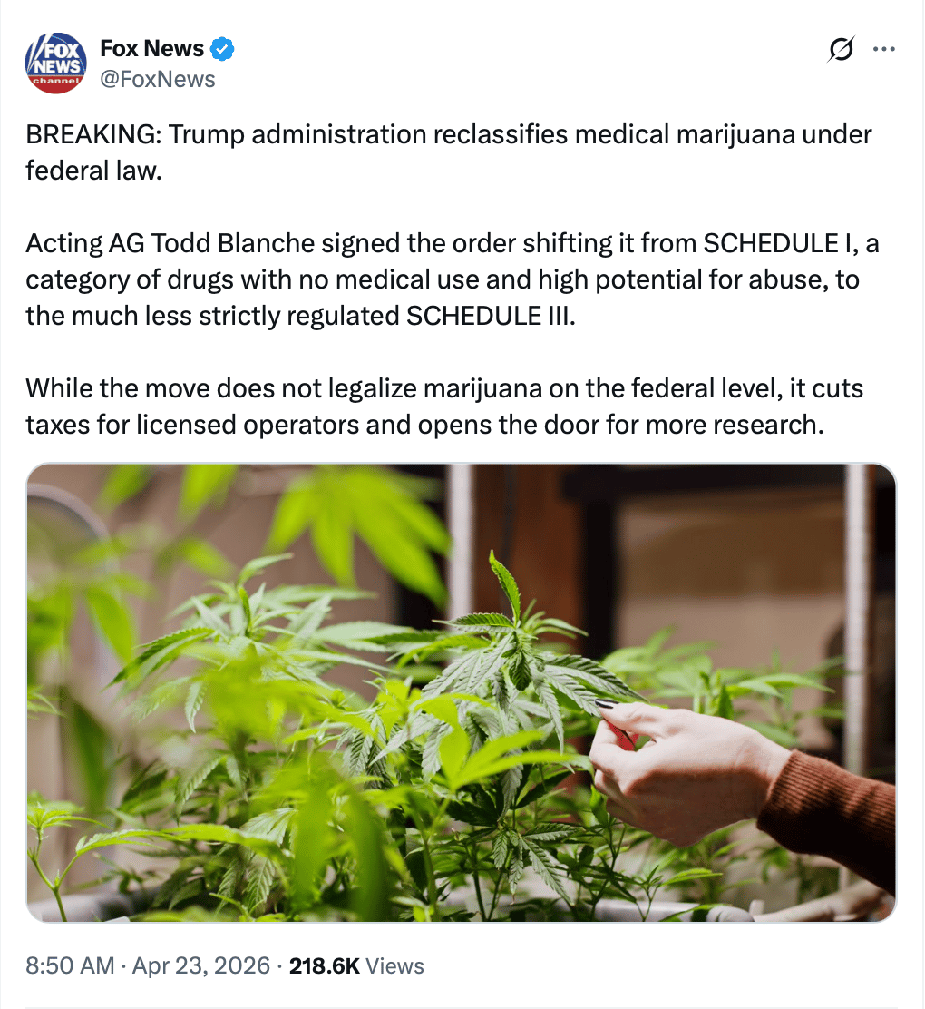 A Reuters headline saying rescheduling is happening "as early as Wednesday" could mean a final rule is being published — not that marijuana has legally moved schedules yet.