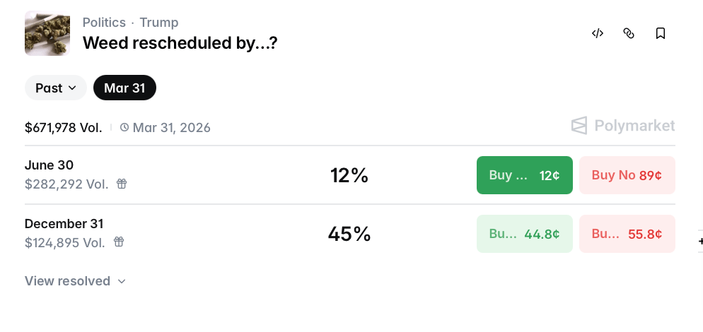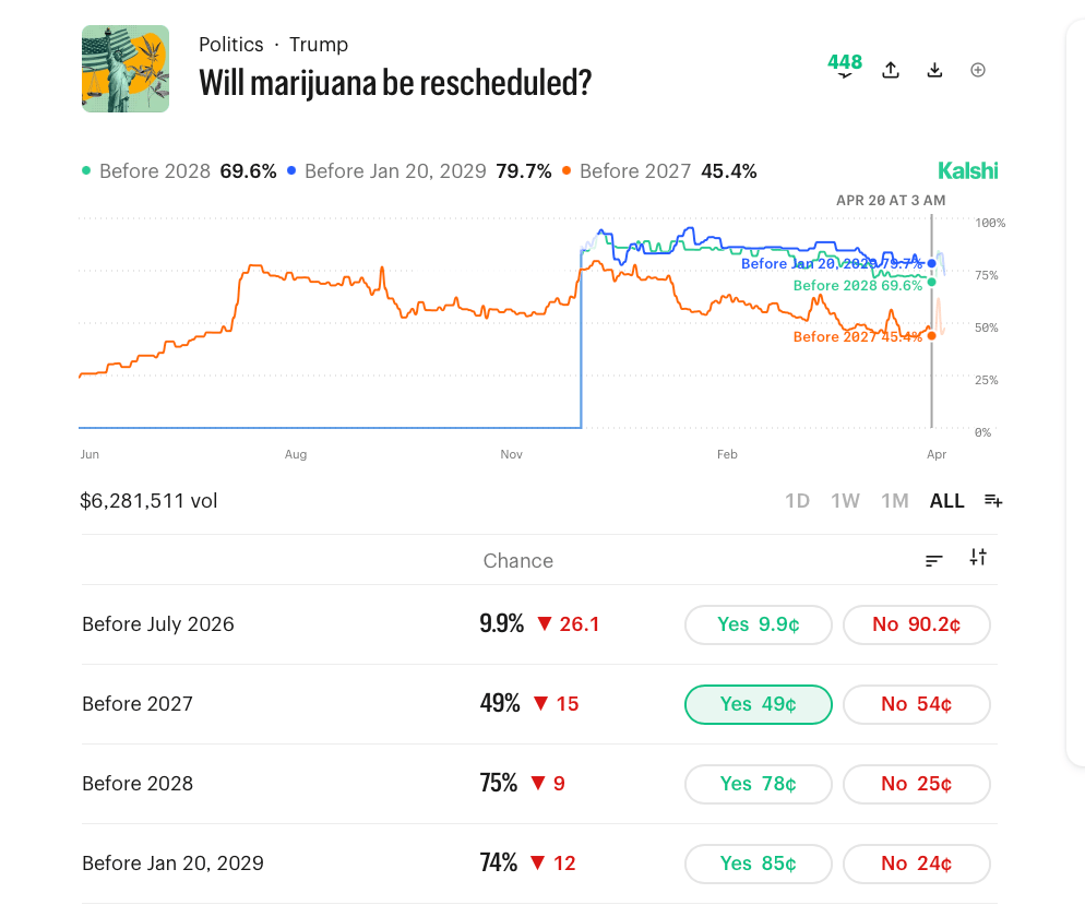 This means the crowd thinks rescheduling almost certainly happens during Trump's second term.